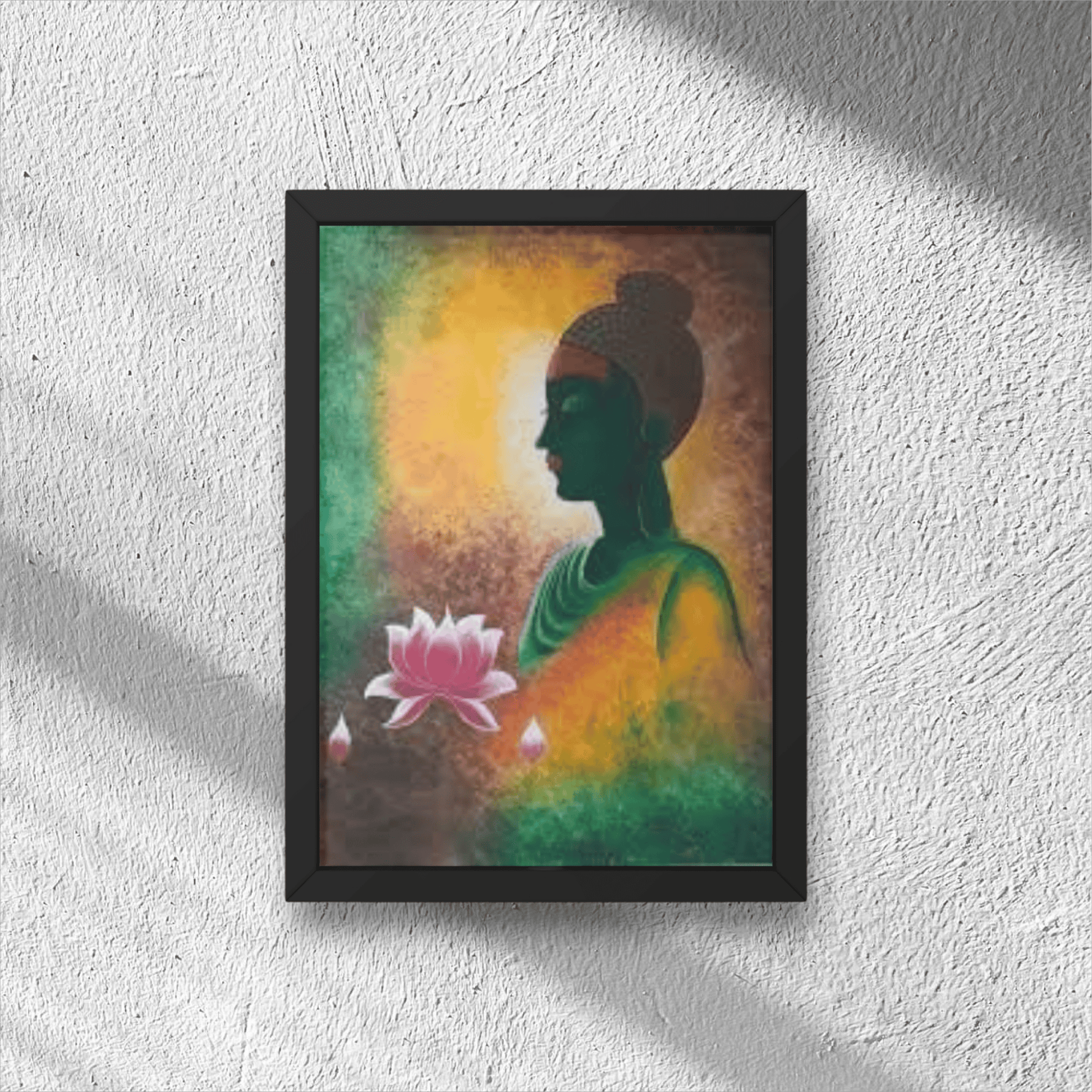 This beautiful painting portrays a tranquil Buddha figure in a meditative pose, complemented by soft pink lotus flowers symbolizing purity and spiritual awakening. The rich green tones of the Buddha blend harmoniously with the warm hues of the background, creating an ethereal and calming effect. The intricate details in the profile and the subtle texture of the background add depth and serenity to the artwork. Measuring 18x24 inches (45x60 cm) in a vertical rectangular format, this piece is perfect for adding a spiritual and peaceful vibe to your home, meditation space, or office. Ideal for those who appreciate art that embodies mindfulness and tranquility.
