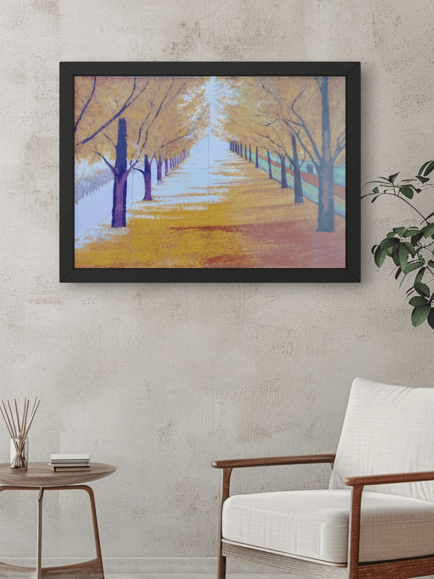 This enchanting painting captures a serene autumn pathway lined with trees adorned in golden-yellow foliage. The perspective draws the viewer's eye toward a vanishing point, creating a sense of depth and tranquility. The play of light and shadow on the pathway enhances the warm, inviting tones of the artwork. Measuring a standard size of 18x24 inches (45x60 cm) in a horizontal rectangular format, this piece brings the beauty of nature into any space. Ideal for living rooms, offices, or bedrooms, it adds a touch of elegance and a calming ambiance. Perfect for nature and art lovers who cherish seasonal landscapes.