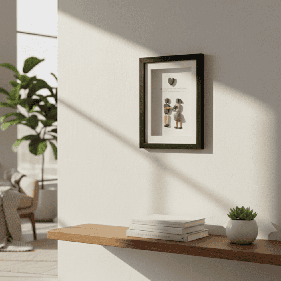 Each pebble is carefully chosen for its shape, texture, and color, ensuring every piece is truly unique. Framed in a sleek black shadow box, this artwork preserves the delicate arrangement while adding an elegant touch, making it a timeless decor piece. It’s a thoughtful gift for anniversaries, weddings, or for anyone who cherishes meaningful connections.