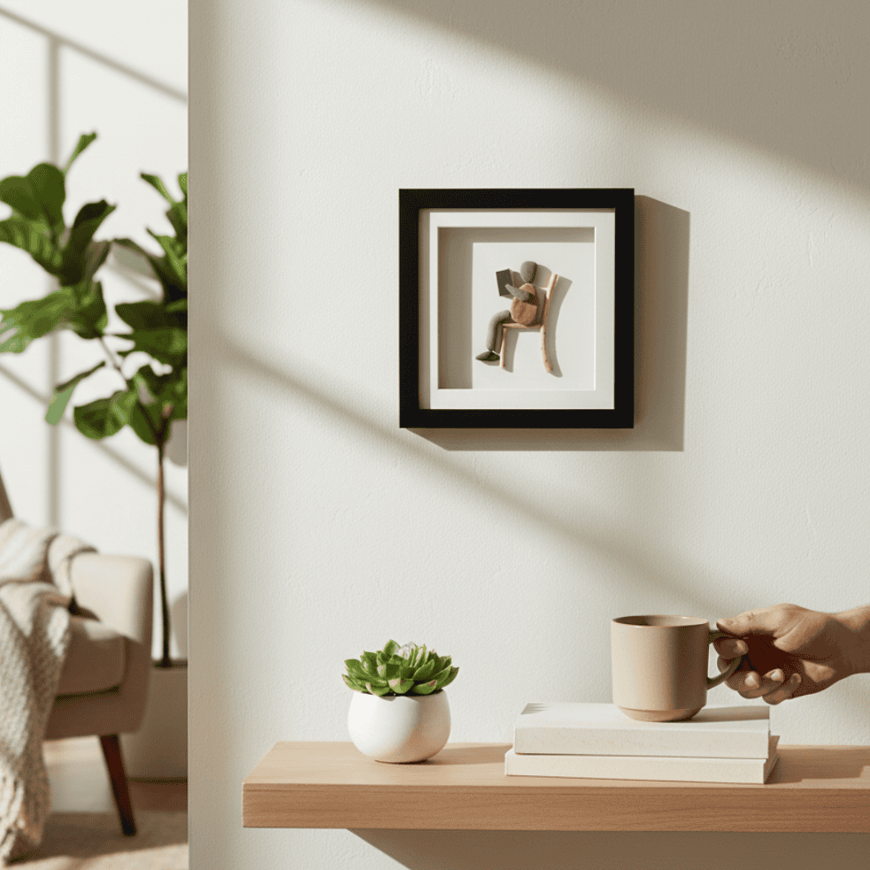 Each pebble and twig is carefully chosen for its shape and texture, ensuring every artwork is unique. Framed in a sleek black shadow box, this piece preserves the delicate arrangement while adding a refined touch, making it a timeless decor item. It's a thoughtful gift for occasions like birthdays, housewarmings, or for anyone who cherishes quiet moments of reflection.