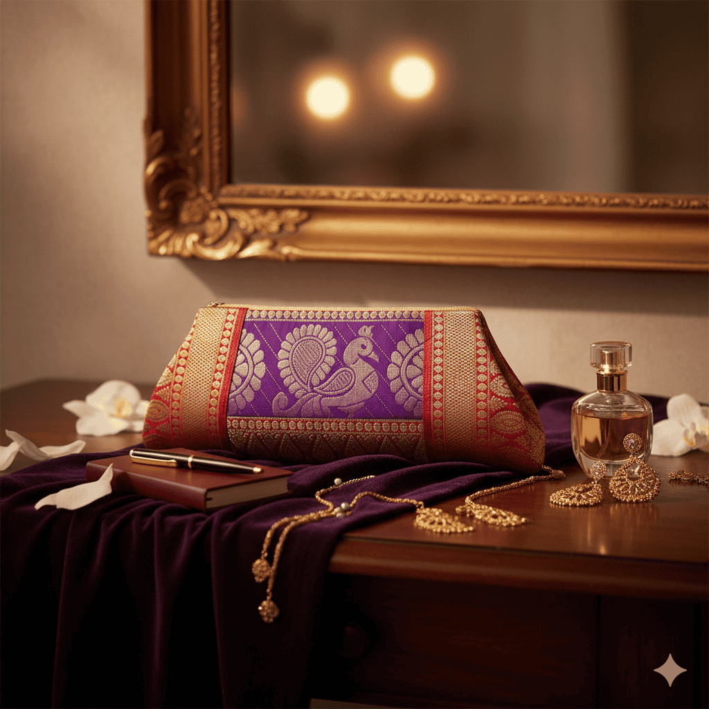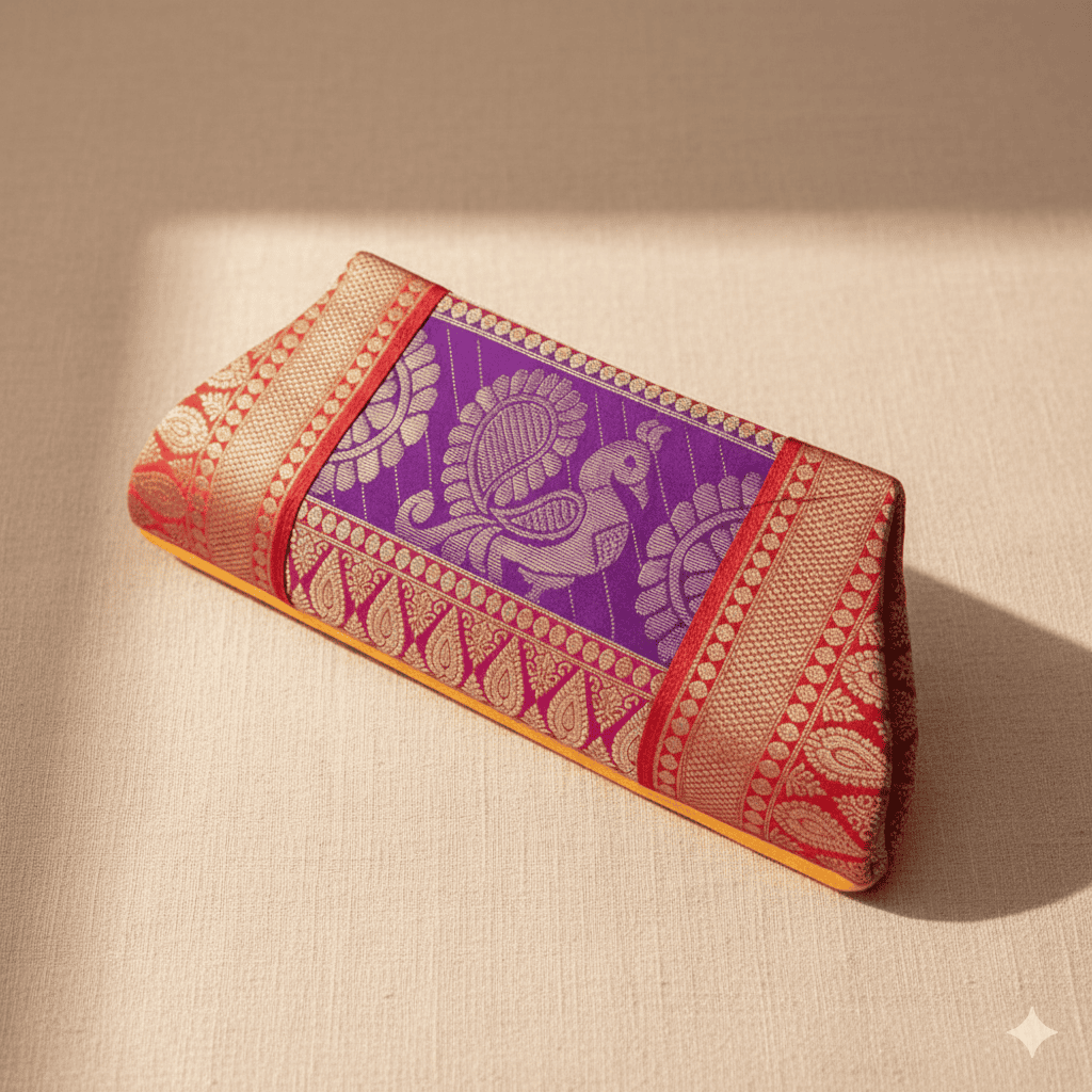 Elevate your style with this exquisite Handmade Peacock Motif Silk Handbag, a perfect blend of tradition and elegance. Crafted with meticulous care, this stunning handbag features intricate handwoven silk fabric adorned with a vibrant peacock design, showcasing the artistry of skilled artisans. The rich purple and pink hues, complemented by golden accents and detailed border patterns, make this bag a true statement piece for any occasion.